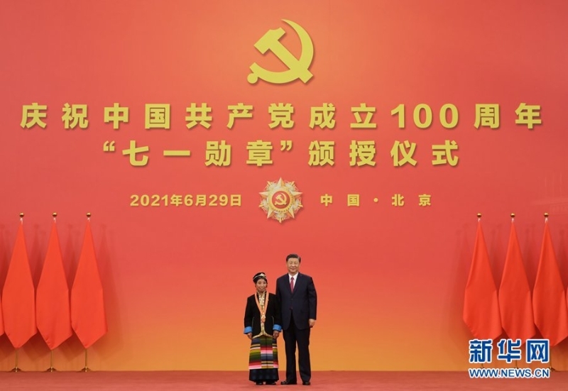 6月29日,庆祝中国共产党成立100周年“七一勋章”颁授仪式在北京人民大会堂金色大厅隆重举行。中共中央总书记、国家主席、中央军委主席习近平向“七一勋章”获得者马毛姐颁授勋章。新华社记者 李学仁 摄
