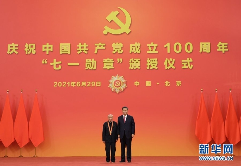 6月29日,庆祝中国共产党成立100周年“七一勋章”颁授仪式在北京人民大会堂金色大厅隆重举行。中共中央总书记、国家主席、中央军委主席习近平向“七一勋章”获得者崔道植颁授勋章。新华社记者 李学仁 摄