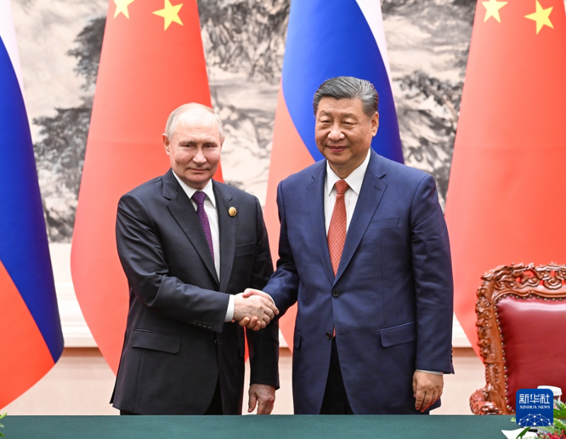 5月16日上午,国家主席习近平在北京人民大会堂同来华进行国事访问的俄罗斯总统普京举行会谈。这是会谈后,两国元首共同签署并发表《中华人民共和国和俄罗斯联邦在两国建交75周年之际关于深化新时代全面战略协作伙伴关系的联合声明》。新华社记者 饶爱民 摄