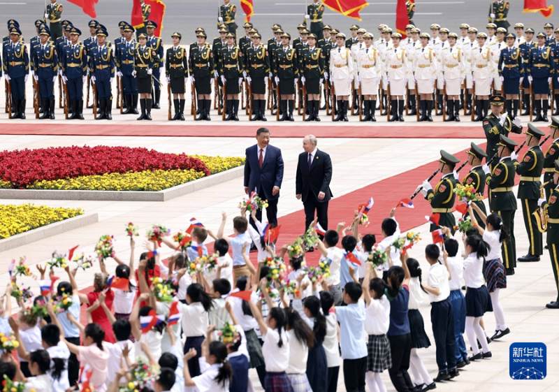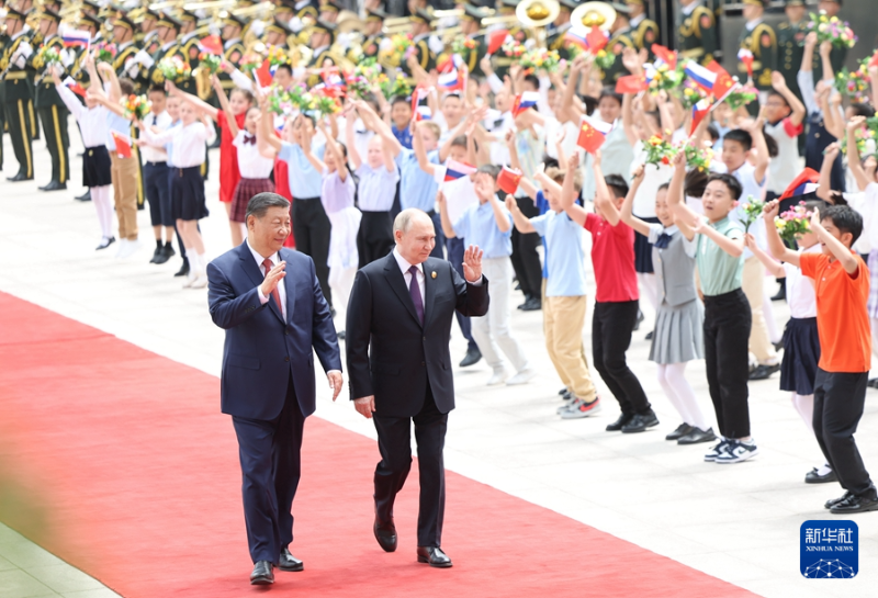 5月16日上午,国家主席习近平在北京人民大会堂同来华进行国事访问的俄罗斯总统普京举行会谈。这是会谈前,习近平在人民大会堂东门外广场为普京举行隆重欢迎仪式。新华社记者 饶爱民 摄