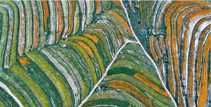 绿水青山就是金山银山。多年来,宁夏大规模开展国土绿化和沙化、荒漠化、小流域综合治理,贺兰山下昔日风沙肆虐的荒滩变成了如今欣欣向荣的绿洲。图为2019年8月13日拍摄的宁夏回族自治区固原市彭阳县旱作梯田。新华社记者 冯开华/摄