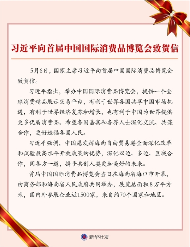 新华社北京5月6日电 5月6日,国家主席习近平向首届中国国际消费品博览会致贺信。