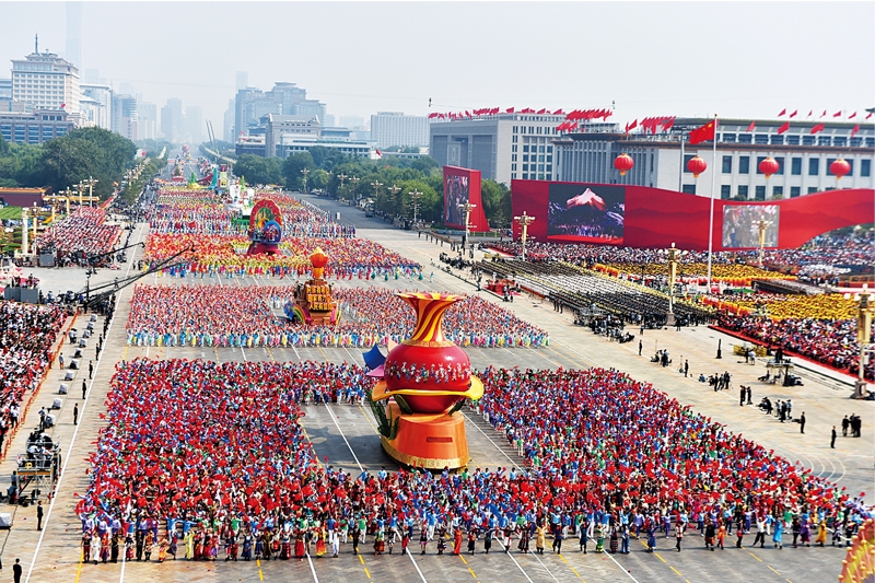 2019年10月1日上午,庆祝中华人民共和国成立70周年大会在北京天安门广场隆重举行。图为“民族团结”方阵(前)通过天安门广场。 新华社记者 徐昱/摄