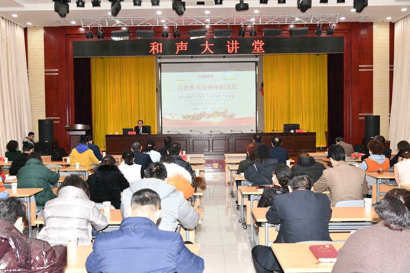 讲座邀请自治区政协常委、宁夏大学继续教育学院(高等职业技术学院)院长刘明教授授课,他以“红色音乐经典中的党史”为题,通过史实解说、视频播放、听歌问答等方式,从开天辟地、洪流滚滚、星火燎原、万水千山、中流砥柱、解放战争、改天换地、奋发图强、改革开放、走向复兴十个方面,阐释了经典红色音乐魂系百年党史,助力党的救国大业、兴国大业、富国大业、强国大业,在革命、建设、改革、复兴中发挥的不可替代的作用。