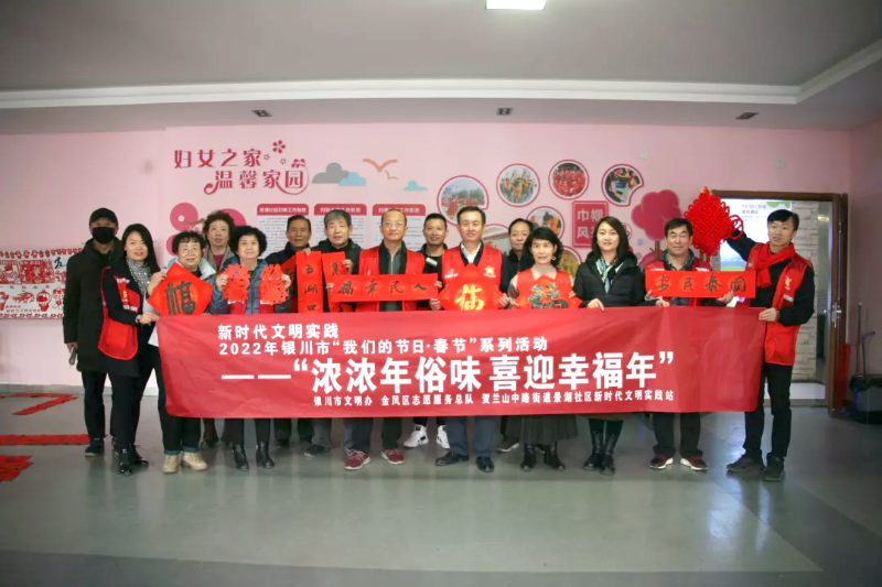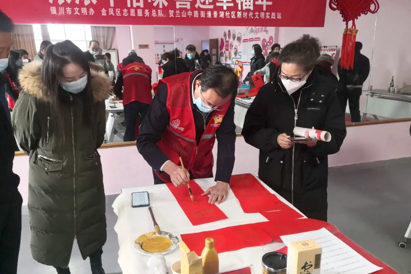 1月20日,银川景湖社区活动中心,驻自治区党委统战部纪检监察组组长于兴章、宁夏书法家协会主席兼秘书长宋琰带领部分民进会员,挥毫泼墨为群众写春联,浓浓的春节气息扑面而来。