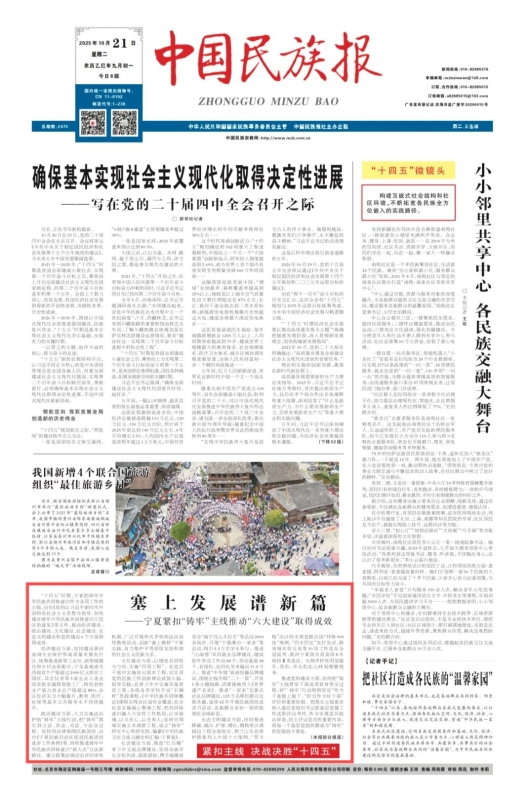 “十四五”时期,宁夏把铸牢中华民族共同体意识作为各项工作的主线,出台《坚持以习近平新时代中国特色社会主义思想为指导、加快建设铸牢中华民族共同体意识示范区的意见》等文件,推动经济建设、政治建设、文化建设、社会建设、生态文明建设和党的建设6个方面取得成效。
