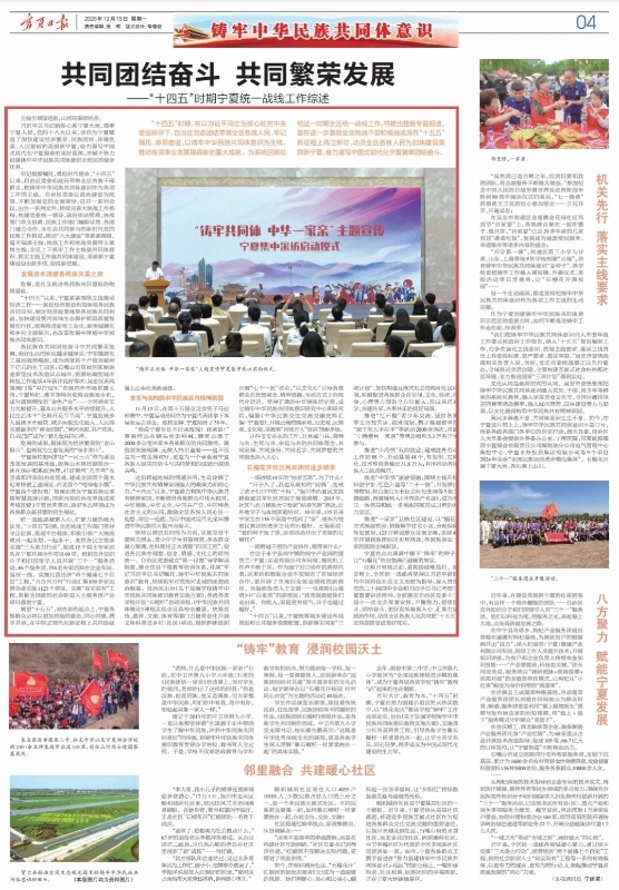 “十四五”时期,在以习近平同志为核心的党中央坚强领导下,自治区党委团结带领全区各族人民,牢记嘱托、感恩奋进,以铸牢中华民族共同体意识为主线,推动各项事业发展取得新的重大成就。为系统回顾总结这一时期全区统一战线工作,特推出整版专题报道,旨在进一步激励全区统战干部和统战成员在“十五五”新征程上再立新功,动员全区各族人民为加快建设美丽新宁夏、奋力谱写中国式现代化宁夏篇章团结奋斗。