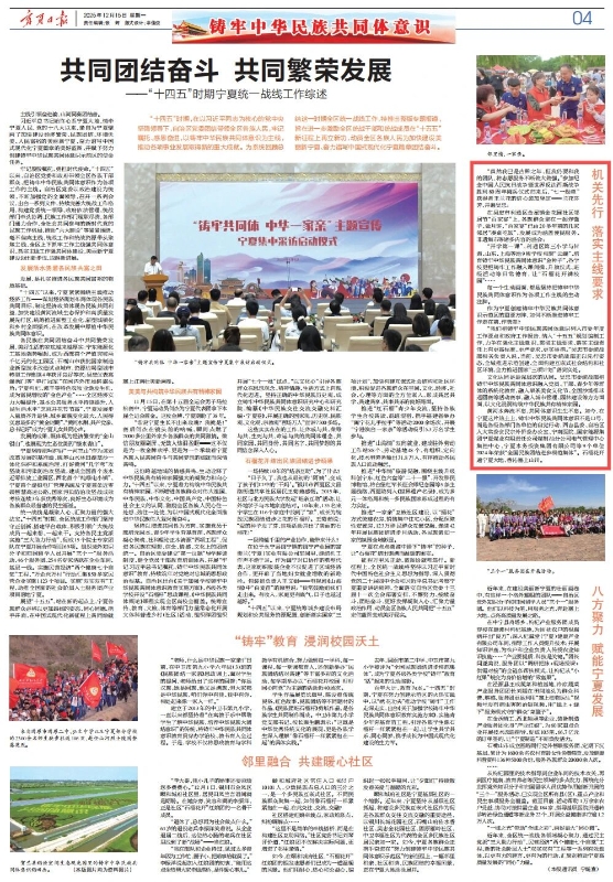 “我们把铸牢中华民族共同体意识列入市委年度工作要点和政府工作报告,纳入‘十五五’规划编制工作,力争在强化主线意识、贯彻主线要求、落实主线责任上有更高标准、更严要求、更实举措。”吴忠市委统战部相关负责人说,当前,吴忠市委统战部正以先行姿态,全域推进示范创建、全面构建互嵌式社会结构和社区环境、全力推进国家“三项计划”落到实处。