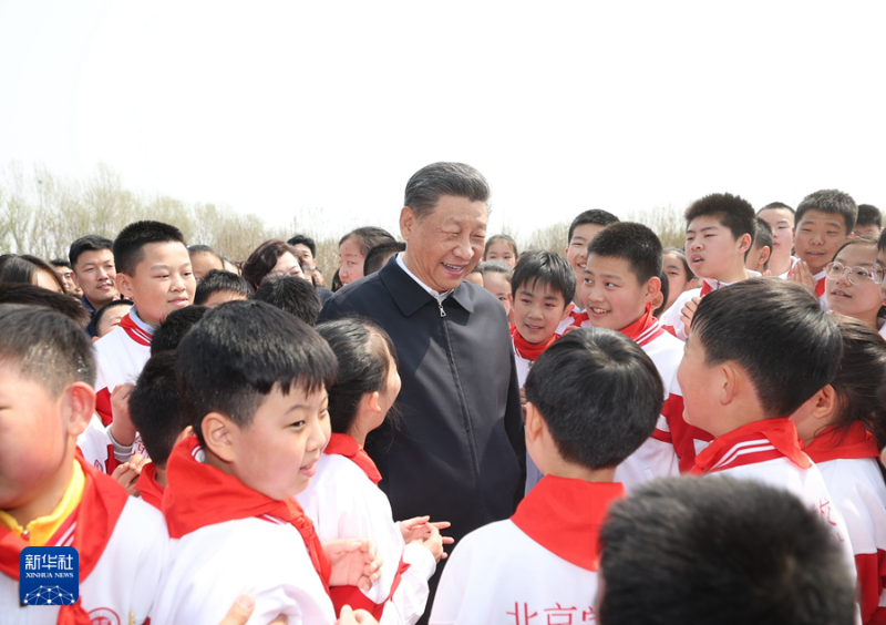 4月3日,党和国家领导人习近平、李强、赵乐际、王沪宁、蔡奇、丁薛祥、李希、韩正等来到北京市通州区潞城镇参加首都义务植树活动。这是习近平同少先队员在一起。新华社记者 鞠鹏 摄