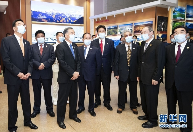 汪洋等走进展厅,一边仔细观看展板,一边认真听取讲解。《十七条协议》签字仪式历史照片、实行民族区域自治制度的展板、对口援藏资金图表、《西藏自治区民族团结进步模范区创建条例》图片……一块块展板、一张张图片图表,生动展现了70年来西藏在党的领导下取得的长足发展。汪洋不时驻足观看,详细询问有关情况,对西藏近年来各项事业取得的成就予以充分肯定。