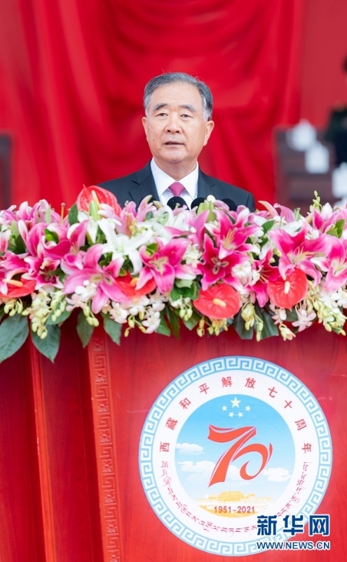 汪洋说,1951年西藏和平解放,是中国人民解放事业和祖国统一事业的重大胜利,是西藏具有划时代意义的历史转折。从此,西藏走上了由黑暗到光明、由落后到进步、由贫穷到富裕、由专制到民主、由封闭到开放的康庄大道,一个欣欣向荣的社会主义新西藏巍然屹立在世界之巅。