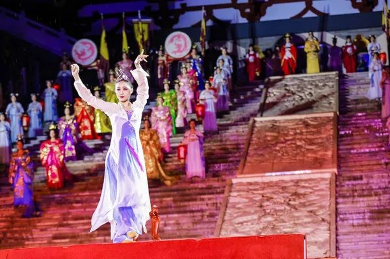 伴随着欢快的音乐,绿色的激光在兴唐苑会盟楼上打出了“千年古县·梦回灵州”八个大字,在一束射光的指引下,舞蹈演员在会盟楼上跳跃起舞,《梦回灵州》正式开始。大型古风实景演出《梦回灵州》共分为十幕,不仅有风姿绰约的独舞《贵妃闪回》,还有大型群舞《贵妃登场》;有展现唐风古韵的《胭脂玉屏风》以及丝路风韵的舞台独舞《西域路漫漫》,还有展现大唐盛世的群舞《唐乐·十二时辰》,展现出贞观盛世唐太宗幸灵州,会见诸部首领,运筹千古民族之策,实现天下大同的历史画卷。整场演出洋溢着“河套千里桑田沃,渠绕古城枣花香”的繁华,流淌着“绿树浓荫夏日长,楼台倒影入池塘”的静谧,不仅展现了古灵州“白日登山望烽火,黄昏饮马傍交河”的边塞风光,也展现了新灵武“树丛沙草群鸥散,万顷江田一鹭飞”的田园景色,体现出灵武作为千年古县的别样韵味。
