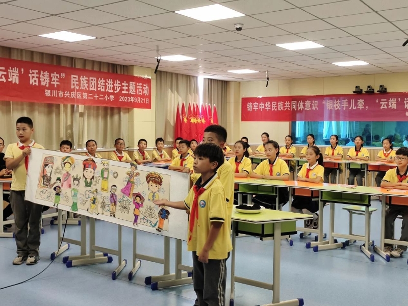 在银川市兴庆区第二十二小学,“银枝手儿牵,‘云端’话铸牢”民族团结进步主题活动已成为该校每年的“固定节目”。借助互联网,银川市兴庆区第二十二小学与湖北省枝江市团结路小学的学生们诵读中华经典诗歌、绘制民族团结主题画、品尝地方特产等,结下深厚的情谊。