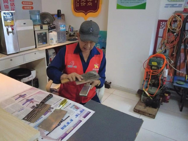 在位于银川市金凤区黄河东路街道的颐和城府社区,从“石榴籽爱心服务站”传出的叮叮当当声吸引着记者们。进门一看,原来是年过古稀的智福德正为社区居民打磨刀具,他身旁的工作台上摆放着各式各样的工具,还有一份写满了服务记录的登记册。