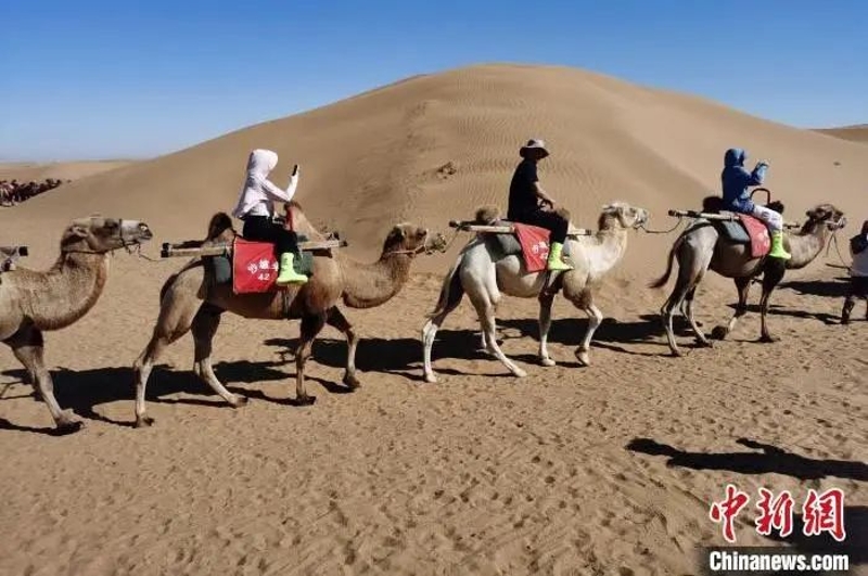 游客在沙坡头景区体验骑骆驼。张乐 摄