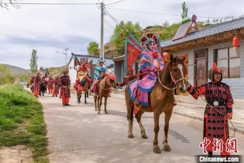 距隆德县城8.5公里的陈靳乡新和村,是国家非遗项目高台马社火的传习基地,记者在此亲历了一场社火表演。当天,村子里旗帜招展、鼓钹齐鸣,20多位社火表演者装扮成关羽、张飞、穆桂英等历史人物,骑乘高头大马列队前行,引得游客也纷纷加入画油彩、穿戏服、骑马等社火表演体验中。有游客称,因为这样的体验,对当地的文化特色产生很深的印象。