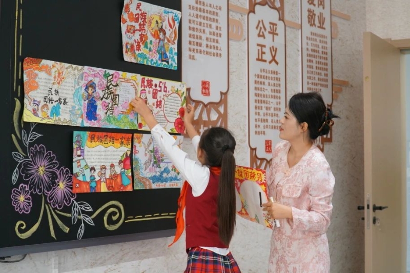 同学们张贴展示民族团结主题的手抄报。