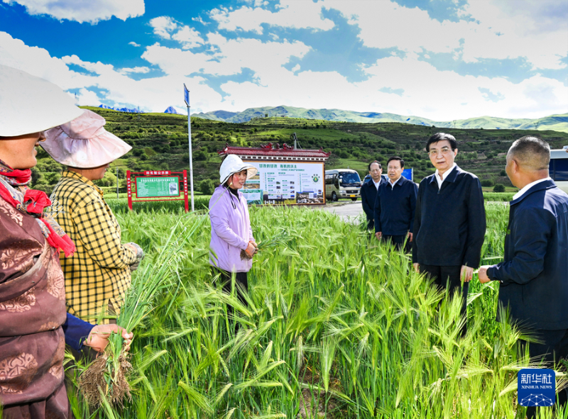 7月1日至3日,中共中央政治局常委、全国政协主席王沪宁在四川甘孜、阿坝调研。这是7月1日王沪宁在甘孜县了解青稞生产情况。新华社记者 饶爱民 摄