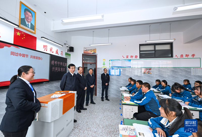 7月1日至3日,中共中央政治局常委、全国政协主席王沪宁在四川甘孜、阿坝调研。这是7月3日王沪宁在阿坝县中学了解开展爱国主义教育和民族团结进步教育情况。新华社记者 饶爱民 摄