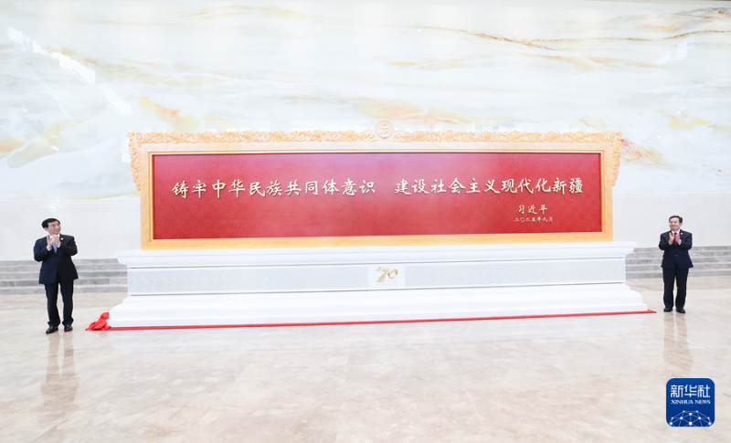 9月25日下午,中共中央政治局常委、全国政协主席、中央代表团团长王沪宁带领中央代表团出席向新疆维吾尔自治区赠送纪念品仪式。中央代表团向新疆赠送了习近平总书记题词贺匾、中华同心尊等纪念品。这是王沪宁和新疆维吾尔自治区党委书记陈小江一同为贺匾揭幕。新华社记者姚大伟 摄